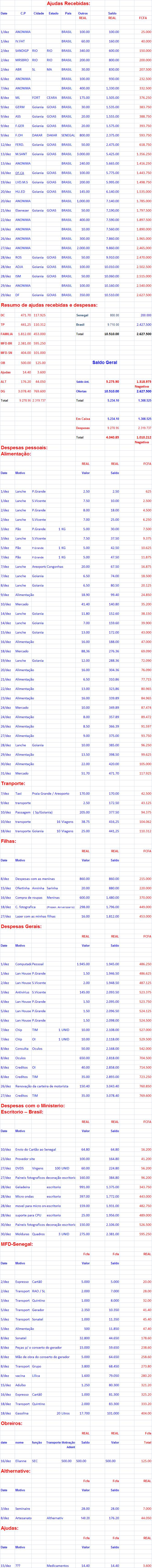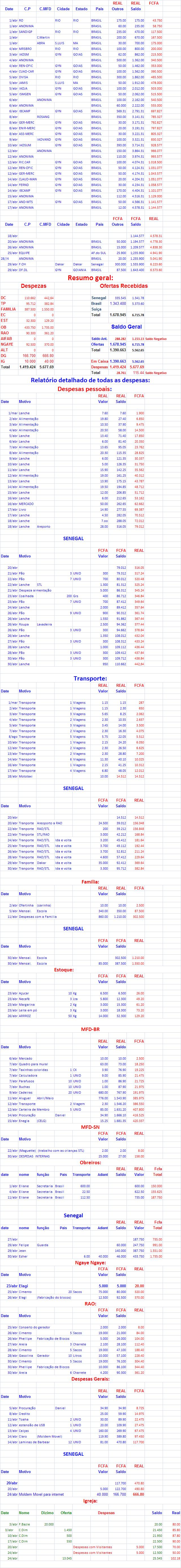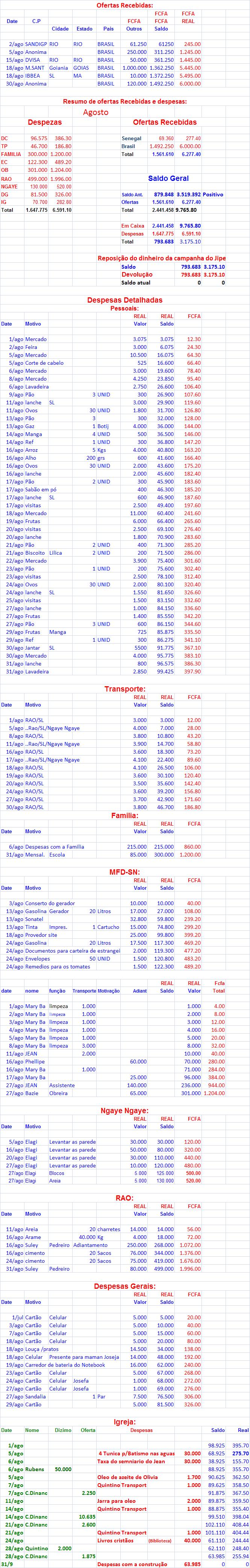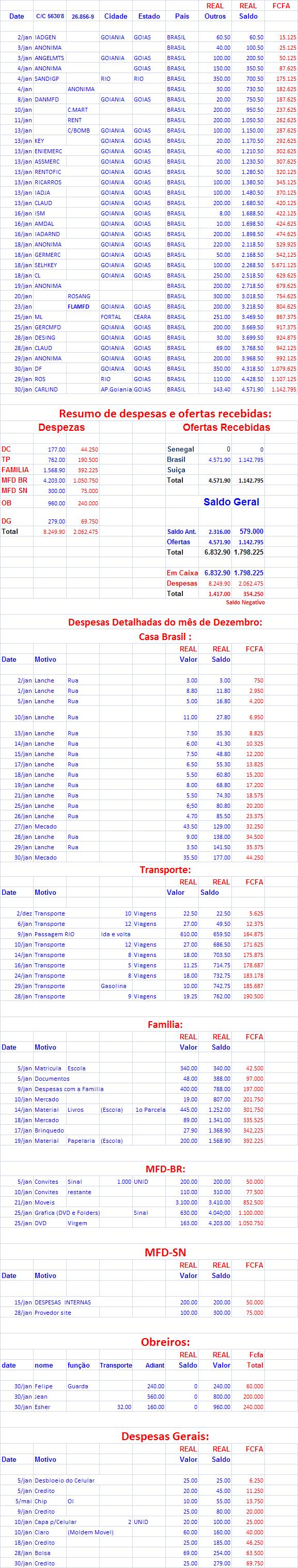 Rubens F. Silva 01/04/2011 Graça e Paz!!!! Aqui vai mais um relatório financeiro. Nele como sempre esta relacionado todas as ajudas recebidase no que usamos essas ajudas . Este mês que passou (Março) foi muito difícil para nós nos manter mos de pé, pois as ajudas que recebemos não cobriu a despesas internas. Com isso estamos no negativo 1.153,13 sem falar que até o dia 10 de Abril temos que conseguir 2.620,00 valor esse que será usado para pagar 20 cadeiras que compramos para a MFD-BR, despesas com uma obreira da MFD-BR, despesa com a minha duas filhas. Orem para que até o dia 10 venhamos saldar esses compromissos, orem também para que antes da minha saída eu consiga o dinheiro para comprar alguns materiais de bordado e costura para levar pra a escola de artesanato sem falar que preciso comprar algumas roupas pessoais e a minha passagem até S.Paulo (aeroporto de Guarulhos) Muito obrigado por vossas orações e apoio Rubens F.Silva Relação de ajudas recebidas: 10/05/2011 Meus amados aqui vão o relatório detalhado das ajudas recebidas no mês de Abril e também no que usamos essas ajudas. Peço aos amados que continuem orando a nosso favor, a exemplo pela conquista do novo carro ainda falta 36.600,00 (reais), pelas construções na base da missão em RAO e na construção de minha casa na aldeia de Ngaye Ngaye. Pelo crescimento do trabalho com as mulheres, a partir de Julho teremos uma pessoa a mais para manter, a pessoa será a esposa do irmão Jean. Ela passará ser obreira integral da missão, ore para que venhamos ter os recursos para manter a irmã. Esse mês para as contas forem pagas em dia temos que conseguir 10.000,00 reais Que o SENHOR os abençoe Rubens F.Silva Relação de ajudas recebidas:
