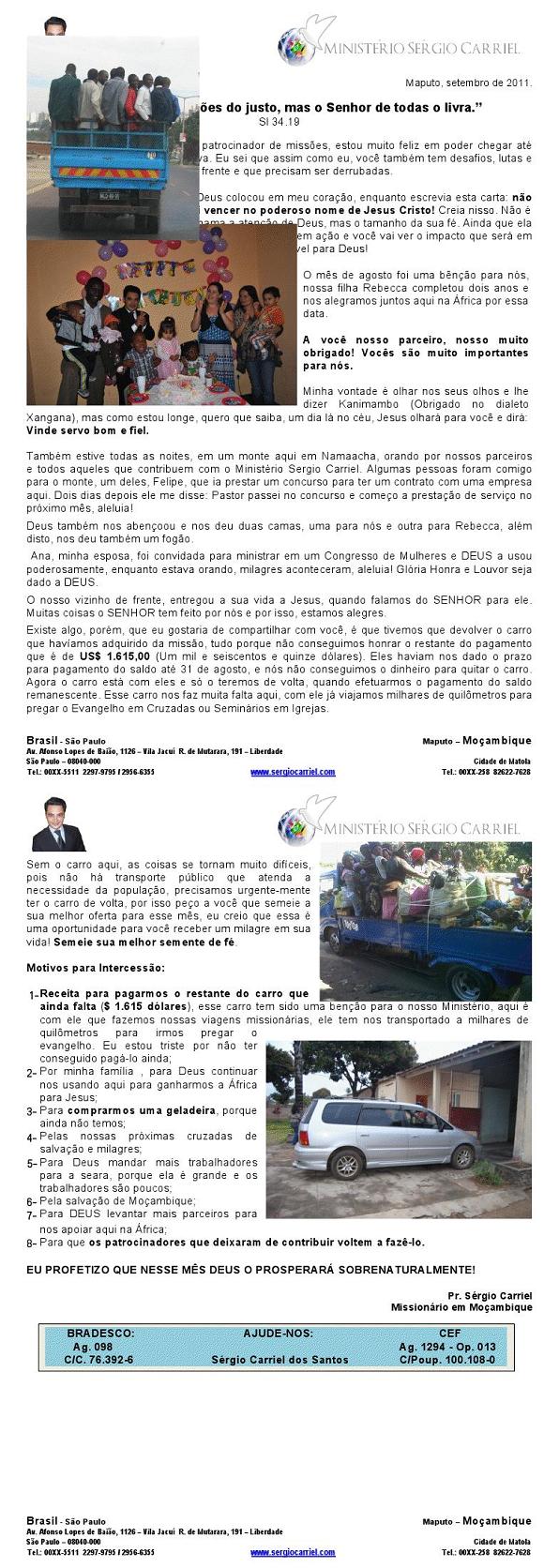 - recursos para pagamento da taxa de visto em Moçambique da Pra. Ana e Rebeca no valor de R$ 2.000,00 agora em abril/11; - realização de Cruzada Evangelística em Junho/11; - realização de Seminários com os Pastores de Moçambique; - assistência social às crianças carentes; - proteção para nossa família e toda equipe; = = = Maputo, abril