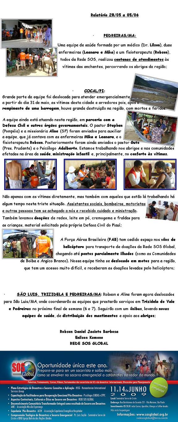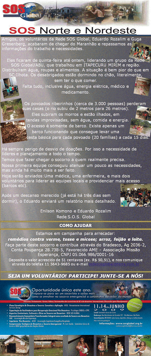 30/04/2009 ![]() Oportunidade única este ano. Prepare-se para ser um socorrista e saiba mais como se envolver no socorro emergencial a catástrofes ao redor do mundo. 11 a 14 de JUNHO 2009 • Plano Estratégico de Desastres e Socorro: Conceitos e Aplicação HISG - Humanitarian International Services Group • Capacitação de Facilitadores para Recuperação Emocional Pós-Desastres Psicólogos EIRENE e CPPC • Aspectos Contextuais, Culturais e Ética no Socorro em Desastres REDE SOS GLOBAL • Desenvolvimento Comunitário Transformador Integral como resultado de Socorro em Desastres AME - Associação Missão Esperança • Capelania Pós-Desastre ACEH - Associação Capelania Evangélica Hospitalar • Compreensão Teológica de Desastres e Socorro Emergencial Pr. Luis Sayão - Seminário Servo de Cristo e IBNU Igreja Batista das Nações Unidas Local _ Seminário Servo de Cristo Endereço: Rua Bartolomeu de Gusmão 521 - Vila Mariana, São Paulo | Veja o mapa Investimento: R$130,00 inclui Cursos, Apostilas, Almoços e Coffee-breaks Não inclui hospedagem ![]() 25/06/2009 O socorro a Maranhão e Piauí continua Queridos apoiadores, Terminou o treinamento abençoado, voltamos a arregaçar as mangas em prol dos que sofrem no norte-nordeste. Os pastores-psicólogos Adalberto e Oldário de Pres. Prudente retornaram no final de semana passado de Cocal, Piauí. Fizeram trabalho de consolo junto ao povo muito necessário e apreciado. A prefeitura fez uma festa de despedida. Reportaram que ainda é grande a necessidade de continuidade do trabalho junto às vítimas da barragem que ruiu. Dia 18/6 o Dr. Enilson Komono, que foi nomeado co-coordenador junto com a Tonica e comigo na coordenação da Rede SOS Global no final do treinamento, foi com a Doris Teixeira - sanitarista, para Maranhão. Trabalhando novamente com a Igreja Congregacional, a ABU e a Universidade Federal, este final de semana distribuíram as doações em Pedreiras, junto à igreja local, totalizando 85 pessoas. Como os desabrigados estão começando a retornar às suas casas, a Doris ajudará a coordenar a limpeza e higiene. Dia 24/6 irei para Piauí com o Guga, nosso coordenador de Logística. Enilson e Doris sairão de MA e irão a PI, para juntos apresentarmos uma proposta de um projeto de construção de bambu e barro para centro comunitário de cursos e treinamentos em Cocal. Os construtores e arquitetos de barua, Prudente e Adamantina estão correndo para preparar o esboço. Dia 26/6 irá uma equipe médica, Dra. Ina e enfermeira Leanara, se juntar a nós para dar continuidade nos atendimentos médicos em Cocal. Não há mais necessidade urgente de doar roupas ou alimentos, porém são necessárias - ofertas em dinheiro e milhagem aérea para cobrir os transportes dos voluntários interestadual e local; - doações dos seguintes MEDICAMENTOS: - para hipertensão - captopril e hidroclorotiazida, - pomada e medicação oral para micose, - antigripal, - antitérmico, - antiinflamatório - remédio para tosse, - todos os antibióticos, - para piodermite Benzetacil e Despacilina, - pomadas, gaze, alcool 70%, SF e água oxigenada, - esparadrapos cirúrgicos. Continuamos precisando de pastores-psicólogos para trabalhar em Cocal. E pedimos as suas incansáveis intercessões e apoio. Os relatórios dos que retornaram do socorro norte-nordeste mostram que Deus está sendo engrandecido nesse ministério de socorrer vítimas de catástrofes. Vamos continuar - Tudo para a glória do Senhor! Juntos pelo Reino, Margaretha Adiwardana Coordenadoria da REDE SOS GLOBAL www.sosglobal.org.br . . . 30 Junho 2009 Fortes chuvas e enchentes deixaram mais de 313 mil pessoas desalojadas e 138 mil desabrigados em 13 Estados brasileiros. Barragens ruíram, rios transbordaram destruindo tudo por onde passava, vitimando pessoas amadas e toda uma vida de esforços, lutas e conquistas. No curso do rio da destruição, ficaram pessoas extremamente traumatizadas, necessitando de apoio emocional, pastoral e psicológico, além de necessidades materiais. Equipes de atendimento médico, pastoral e psicológico foram enviadas, junto com mais de 11 toneladas de doações de alimentos, água, colchões e medicamentos. . . .