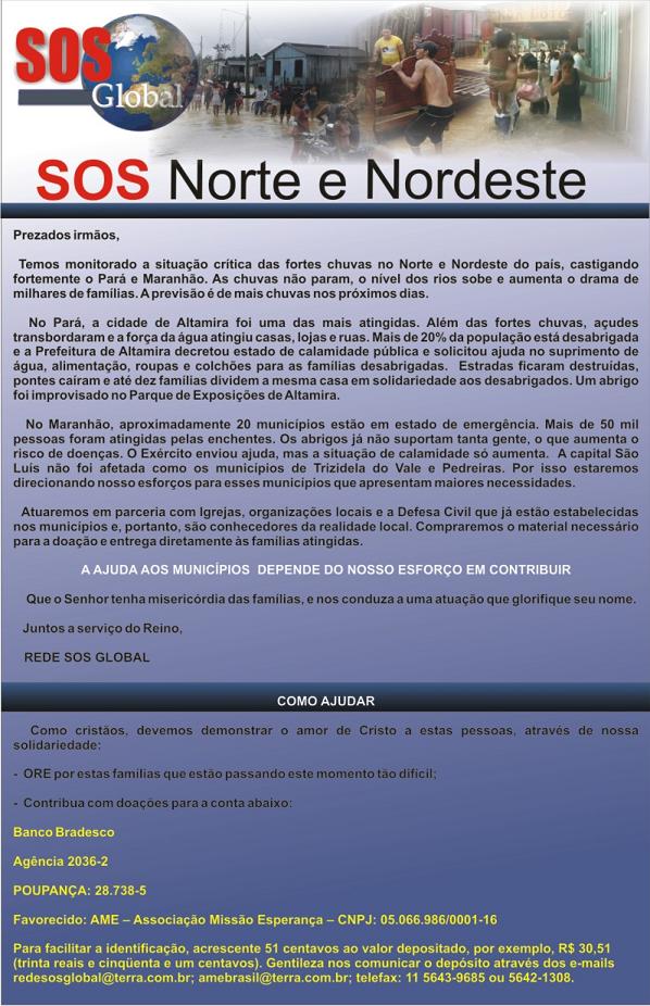 favor dos desabrigados da chuva em todo o interior dos estados nordestinos.