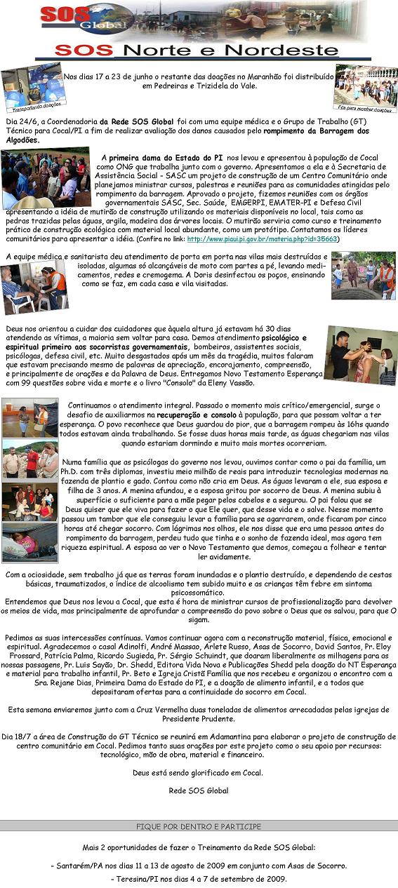 a Rede SOS Global deve enviar uma equipe para Cocal/PI. Planejamos