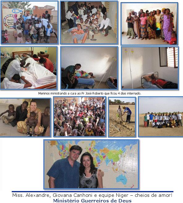 “Estas coisas diz o santo, o verdadeiro, aquele que tem a chave de Davi, que abre, e ninguém fechará, e que fecha, e ninguém abrirá: Conheço as tuas obras – eis que tenho posto diante de ti uma porta aberta, a qual ninguém pode fechar – que tens pouca força, entretanto, guardaste a minha palavra e não negaste o meu nome.” Apocalipse 3.7,8 Graça e Paz, Compartilhando bênçãos e informações do campo missionário e dos missionários Guerreiros de Deus no Niger. Adolescentes do Projeto: Os adolescentes do projeto estão crescendo, alguns deles desenvolvendo sobremaneira espiritualmente e outros tem enfrentado muitas dificuldades sociais de desprezo e pressão o que tem prejudicado o crescimento de alguns por medo e pressão. Agora o que desejamos é que nenhum deles se perca, que eles possam crescer nos caminhos do Senhor e que possamos ter mais estratégias para trabalhar com eles. Missionário Herbert e família: O Amado Missionário Herbert passou por uma cirurgia de hérnia de disco no início de outubro e já passou pelo período de recuperação, pela graça de Deus podemos acompanhá-lo na cirurgia, e orar por ele e sua família. Louvamos a Deus pois alguns pastores amigos ajudaram a cobrir o valor necessário para a cirurgia, bem como a igreja ao qual ele faz parte. A esposa dele e suas filhas também precisam muito das suas orações, pois são meninas pequenas e lindas que amam missões e louvamos a Deus por isto, pois é um presente para a vida do Miss. Herbert e Lúcia. Herbert já reassumiu as atividades no ministério e este mês volta o trabalho de esportes sobre a liderança dele. Missionária Josefa: Em setembro ela passou por 3 recaídas de malária e infecção urinária. A Missionária Josefa precisa das suas orações, para que possa melhorar a sua saúde e resistência. Também tem nos ajudado muito nas áreas dos projetos de alimentação. Clamamos para que Deus possa enviar pessoas para serem companheiros da irmã Josefa. Outros projetos MGD Niger: Continuamos trabalhando forte na área de nutrição no Niger, como grande estratégia para levar o Evangelho aos pequeninos, marcenaria para adolescentes, projeto com as mulheres na área de costura e alfabetização, e adoção de pastores locais. Também a exibição de filmes ao ar livre foi reativada e já está funcionando sempre, precisamos de mais filmes com áudio em francês, também o trabalho de futebol continua. Agradecimentos · Aos irmãos que tem se levantado como intercessores do MGD; · Aos amados mantenedores, 100 vezes mais em nome de Jesus; · A amada missionária Florence e Débora Zagre que se juntaram a nossa equipe no trabalho com as mulheres, obrigado pela parceria, amizade, fidelidade e companheirismo; · Pelos irmãos que tem demonstrado desejo de visitar o Niger. Pedidos de Oração · Pela saúde de todos os missionários envolvidos no Niger; · Pelo projeto de marcenaria com os meninos maiores e projeto casa das Flores com as meninas e mulheres; · Pelo tempo que estamos fora do Niger, como líderes, mobilizando pessoas, recursos e ajuda (para que haja crescimento) ; · Para que Deus levante obreiros que amem o ministério e compartilhem da mesma visão: Amor pelas almas; · Pelo grupo que vai ao Niger 2010. IMPORTANTE: No mês passado saiu uma matéria que para a glória de Deus foi publicada pela globo.com, glória de Deus porque sabemos que o nome do Senhor Jesus foi glorificado através desta entrevista e missões foi divulgado para muitas pessoas que desconhecem que existe este tipo de trabalho. Recebemos muitos e-mails parabenizando e de pessoas dizendo que vão começar a orar mais por missionários do mundo todo, e recebemos também ameaças de alguns muçulmanos brasileiros. Contamos com suas orações! Miss. Alexandre e Giovana Canhoni– amando cada vez mais este povo! MAISON