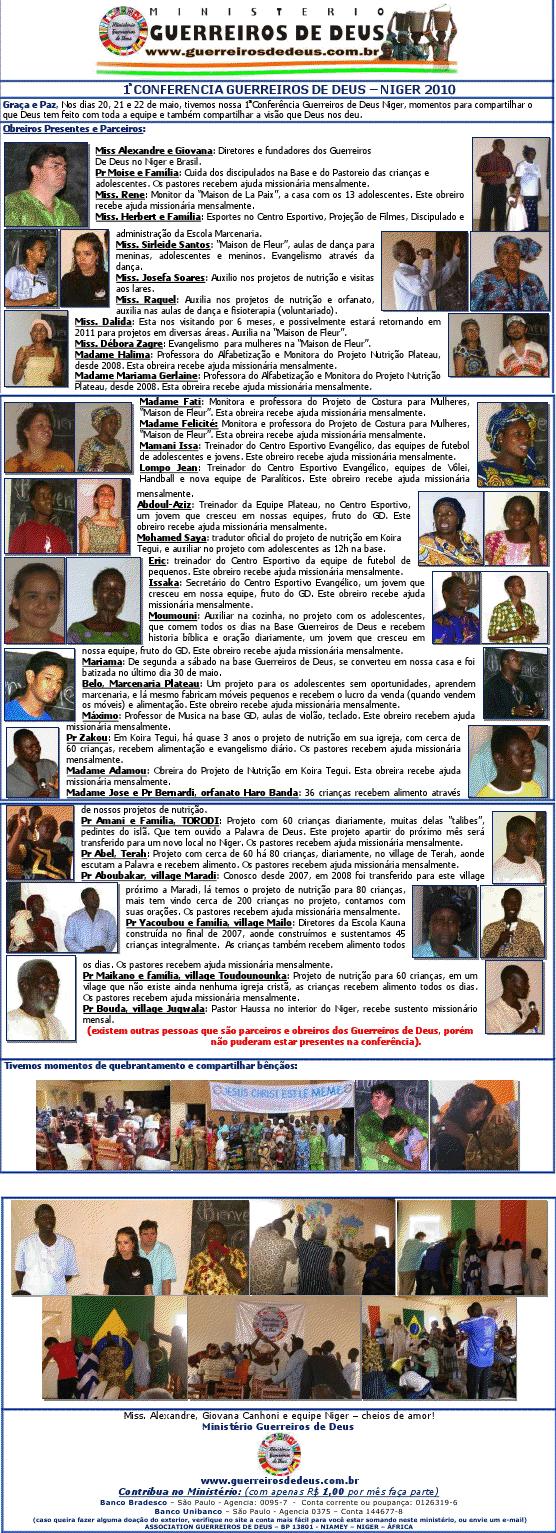 Quem está no Brasil a conta destinada para esta necessidade atual é: Unibanco – Agencia 0375 – Conta 144677-8 – Instituto Social e Comunitario Guerreiros de Deus (para a reforma do Centro Esportivo atual). No exterior poderá entrar em contato conosco para enviar diretamente via Wester Union. Agradecemos desde já e desejamos 100 vezes mais. Obrigado por podermos contar com você! Miss. Alexandre, Giovana Canhoni e equipe Niger – cheios de amor!Ministério Guerreiros de Deus 1ͣ CONFERENCIA GUERREIROS DE DEUS – NIGER 2010 Graça e Paz, Nos dias 20, 21 e 22 de maio, tivemos nossa 1ͣ Conferência Guerreiros de Deus Niger, momentos para compartilhar o que Deus tem feito com toda a equipe e também compartilhar a visão que Deus nos deu. Obreiros Presentes e Parceiros: Miss Alexandre e Giovana: Diretores e fundadores dos Guerreiros de Deus no Niger e Brasil. Pr Moise e Família: Cuida dos discipulados na Base e do Pastoreio das crianças e adolescentes. Os pastores recebem ajuda missionária mensalmente. Miss. Rene: Monitor da “Maison de La Paix”, a casa com os 13 adolescentes. Este obreiro recebe ajuda missionária mensalmente. Miss. Herbert e Família: Esportes no Centro Esportivo, Projeção de Filmes, Discipulado e administração da Escola Marcenaria. Miss. Sirleide Santos: “Maison de Fleur”, aulas de dança para meninas, adolescentes e meninos. Evangelismo através da dança. Miss. Josefa Soares: Auxilio nos projetos de nutrição e visitas aos lares. Miss. Raquel: Auxilia nos projetos de nutrição e orfanato, auxilia nas aulas de dança e fisioterapia (voluntariado). Miss. Dalida: Esta nos visitando por 6 meses, e possivelmente estará retornando em 2011 para projetos em diversas áreas. Auxilia na “Maison de Fleur”. Miss. Débora Zagre: Evangelismo para mulheres na “Maison de Fleur”. Madame Halima: Professora do Alfabetização e Monitora do Projeto Nutrição Plateau, desde 2008. Esta obreira recebe ajuda missionária mensalmente. Madame Mariama Gerlaine: Professora do Alfabetização e Monitora do Projeto Nutrição Plateau, desde 2008. Esta obreira recebe ajuda missionária mensalmente. Madame Fati: Monitora e professora do Projeto de Costura para Mulheres, “Maison de Fleur”. Esta obreira recebe ajuda missionária mensalmente. Madame Felicité: Monitora e professora do Projeto de Costura para Mulheres, “Maison de Fleur”. Esta obreira recebe ajuda missionária mensalmente. Mamani Issa: Treinador do Centro Esportivo Evangélico, das equipes de futebol de adolescentes e jovens. Este obreiro recebe ajuda missionária mensalmente. Lompo Jean: Treinador do Centro Esportivo Evangélico, equipes de Vôlei, Handball e nova equipe de Paralíticos. Este obreiro recebe ajuda missionária mensalmente. Abdoul-Aziz: Treinador da Equipe Plateau, no Centro Esportivo, um jovem que cresceu em nossas equipes, fruto do GD. Este obreiro recebe ajuda missionária mensalmente. Mohamed Saya: tradutor oficial do projeto de nutrição em Koira Tegui, e auxiliar no projeto com adolescentes as 12h na base. Eric: treinador do Centro Esportivo da equipe de futebol de pequenos. Este obreiro recebe ajuda missionária mensalmente. Issaka: Secretário do Centro Esportivo Evangélico, um jovem que cresceu em nossa equipe, fruto do GD. Este obreiro recebe ajuda missionária mensalmente. Moumouni: Auxiliar na cozinha, no projeto com os adolescentes, que comem todos os dias na Base Guerreiros de Deus e recebem historia bíblica e oração diariamente, um jovem que cresceu em nossa equipe, fruto do GD. Este obreiro recebe ajuda missionária mensalmente. Mariama: De segunda a sábado na base Guerreiros de Deus, se converteu em nossa casa e foi batizada no último dia 30 de maio. Belo, Marcenaria Plateau: Um projeto para os adolescentes sem oportunidades, aprendem marcenaria, e lá mesmo fabricam móveis pequenos e recebem o lucro da venda (quando vendem os móveis) e alimentação. Este obreiro recebe ajuda missionária mensalmente. Máximo: Professor de Musica na base GD, aulas de violão, teclado. Este obreiro recebem ajuda missionária mensalmente. Pr Zakou: Em Koira Tegui, há quase 3 anos o projeto de nutrição em sua igreja, com cerca de 60 crianças, recebem alimentação e evangelismo diário. Os pastores recebem ajuda missionária mensalmente. Madame Adamou: Obreira do Projeto de Nutrição em Koira Tegui. Esta obreira recebe ajuda missionária mensalmente. Madame Jose e Pr Bernardi, orfanato Haro Banda: 36 crianças recebem alimento através de nossos projetos de nutrição. Pr Amani e Família, TORODI: Projeto com 60 crianças diariamente, muitas delas “talibes”, pedintes do islã. Que tem ouvido a Palavra de Deus. Este projeto apartir do próximo mês será transferido para um novo local no Niger. Os pastores recebem ajuda missionária mensalmente. Pr Abel, Terah: Projeto com cerca de 60 há 80 crianças, diariamente, no village de Terah, aonde escutam a Palavra e recebem alimento. Os pastores recebem ajuda missionária mensalmente. Pr Aboubakar, village Maradi: Conosco desde 2007, em 2008 foi transferido para este village próximo a Maradi, lá temos o projeto de nutrição para 80 crianças, mais tem vindo cerca de 200 crianças no projeto, contamos com suas orações. Os pastores recebem ajuda missionária mensalmente. Pr Yacoubou e família, village Mailo: Diretores da Escola Kauna construída no final de 2007, aonde construímos e sustentamos 45 crianças integralmente. As crianças também recebem alimento todos os dias. Os pastores recebem ajuda missionária mensalmente. Pr Maikano e família, village Toudounounka: Projeto de nutrição para 60 crianças, em um vilage que não existe ainda nenhuma igreja cristã, as crianças recebem alimento todos os dias. Os pastores recebem ajuda missionária mensalmente. Pr Bouda, village Jugwala: Pastor Haussa no interior do Niger, recebe sustento missionário mensal. (existem outras pessoas que são parceiros e obreiros 